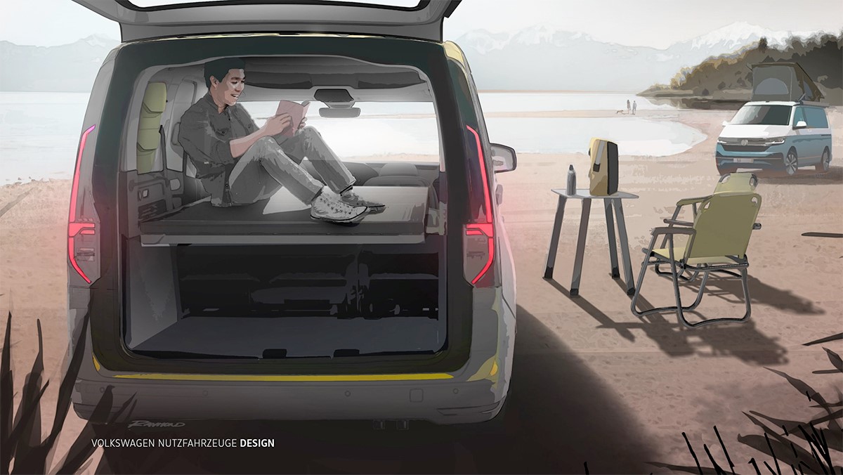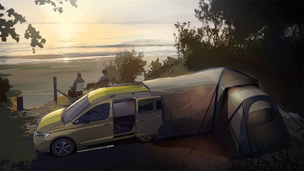 Þessar hugmyndarteikningar eru fyrsta opinbera sýnin á nýja Volkswagen Caddy Mini-Camper. Hann er arftaki gamla Caddy Beach, sem býður upp á úrval af þægindauppfærslum og nokkrum aukabúnaði. Þessi nýi Camper mun verða frumsýndur í september áður en hann fer í sölu síðar á þessu ári.