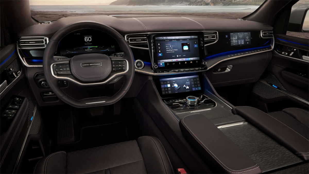 Jeep hefur heldur ekki haldið aftur af sér varðandi við tæknina. Stýrishús Wagoneer er með næstum 45 tommur samtals í skjám, með 12,3 tommu stafrænu mælaborði, 12,1 tommu miðlægu upplýsingakerfi, 10,25 tommu skjá fyrir loftslagsstýringu bílsins og aukalega 10,25 tommu skjá sem er festur á farþegahlið mælaborðsins.