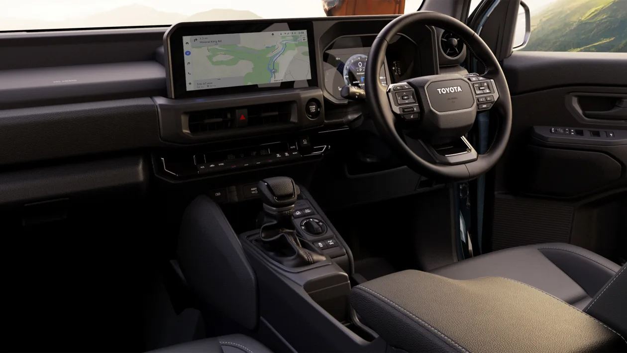 Að innan er stór upplýsingaskjár í miðjunni, með því sem lítur út eins og stór rönd fyrir loftslagsstýringar undir. Þar er einfalt stafrænt mælaborð, þykk gírstöng og fullt af efnislegum rofum, umkringt því sem lítur út fyrir að vera mikið af slitsterku, fjölskylduvænu efni. Stór handföng á A-súlunni eru annað dæmigert stílmerki Land Cruiser.