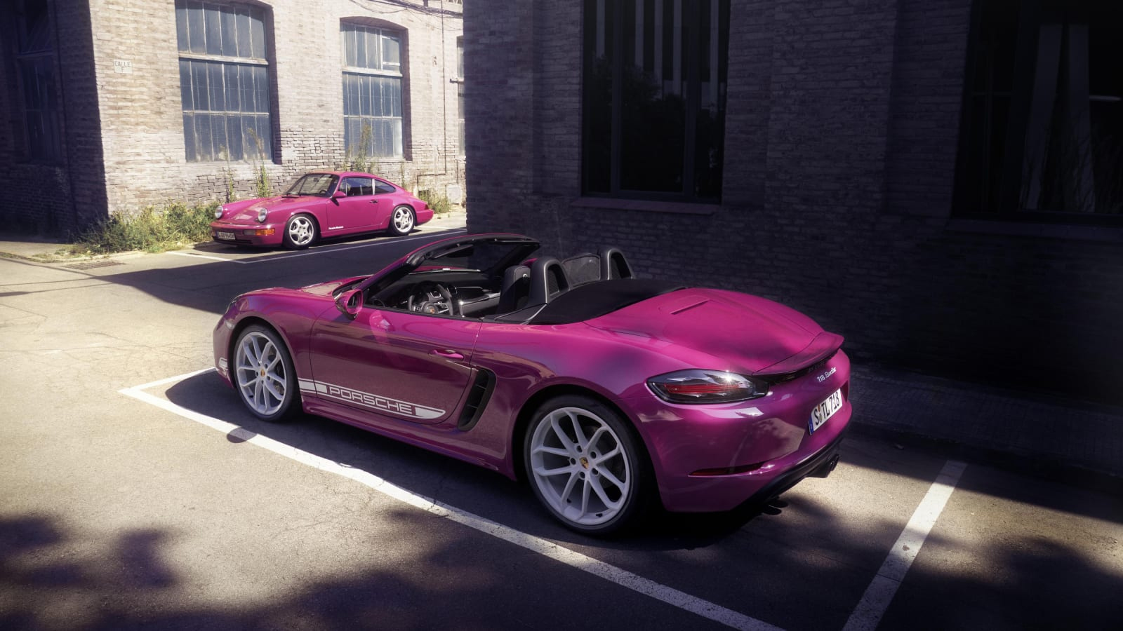Ef þú velur Boxster færðu líka „Boxster“ merkingu upphleypta í blæjutoppinn. Svo er það glæsilega bleika málningin á Boxster – þetta er nútímaleg túlkun á „Ruby Star 964 Carrera RS (eins og sést á bak við á myndinni hér efst).