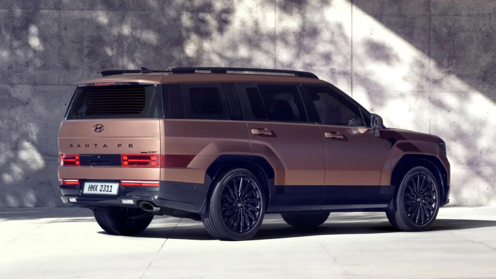 Hyundai segir okkur líka að hjólhaf Santa Fe hafi verið lengt en til að skapa meira áberandi stellingu eru breiðar hjólaskálar sem hýsa 21 tommu álfelgur. Afturljósin eru H-laga eins og þau að framan og nafnið „Santa Fe“ er skráð yfir skottlokið.