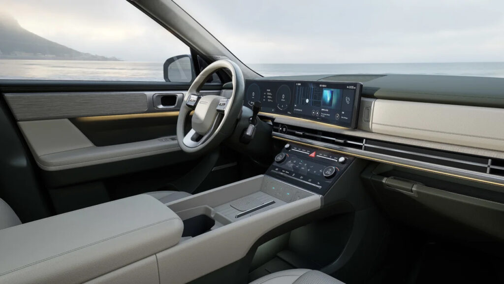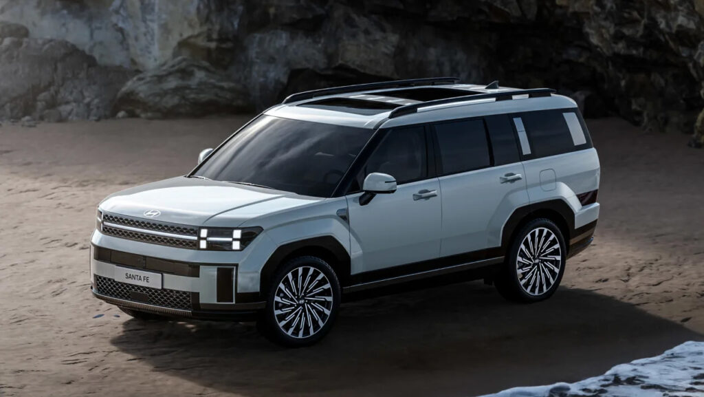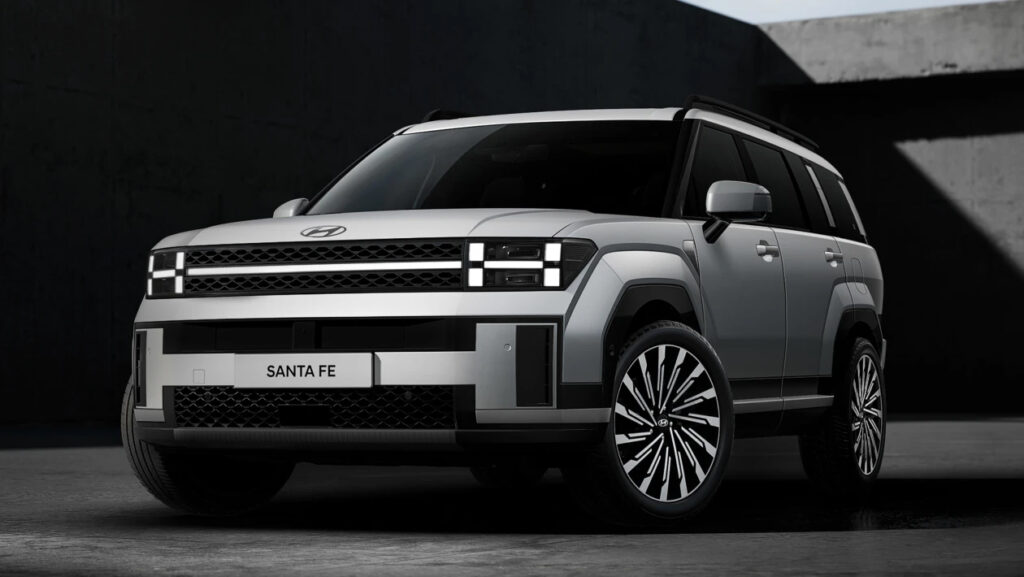Valkostur við væntanlegan alrafmagnaða Ioniq 7 sportjeppann, fær Santa Fe einhverja Ioniq-innblásna hönnun sem blómstrar eins og kantað yfirborð, slétt framhlið og með LED ljósastiku í fullri breidd. Hyundai segir að „H-laga“ framljósin „samræmist H-mótífinu“ á framstuðaranum.