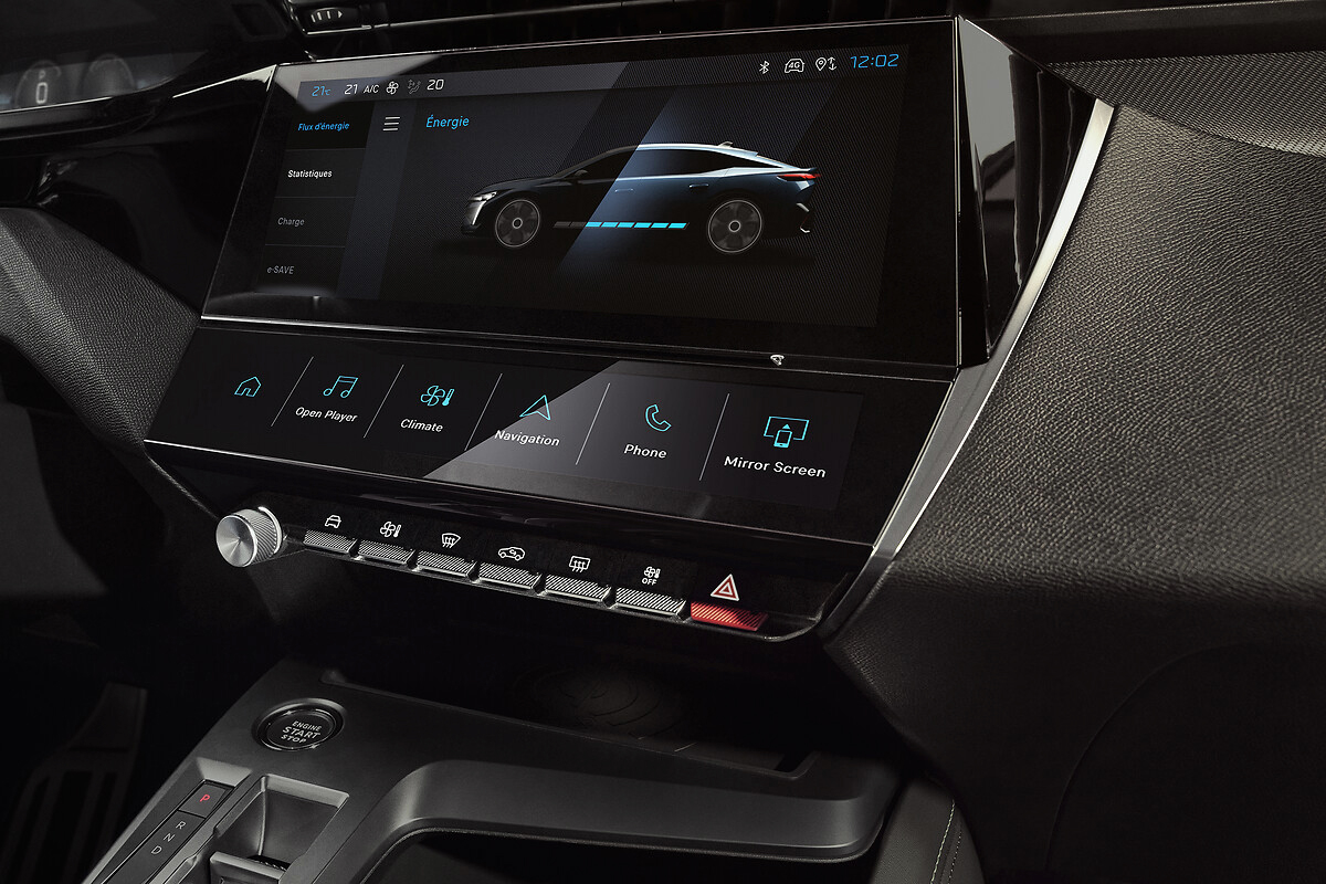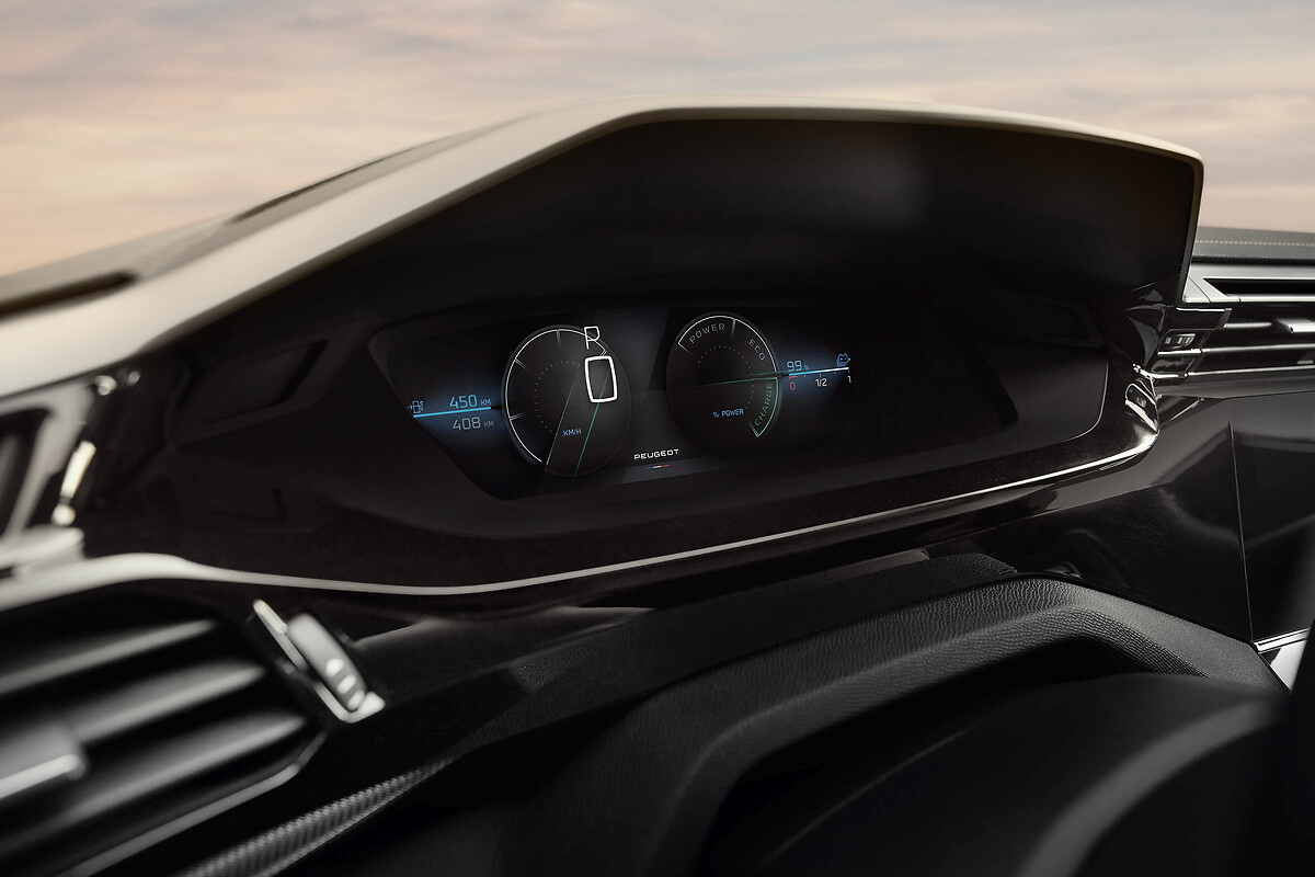 Sama er uppi á teningnum að innan, e-408 er með sama i-Cockpit (lítið stýri og hækkað 10 tommu mælaborð) og 408 með brunavél, ásamt 10 tommu upplýsinga- og afþreyingarskjá, þráðlausum Apple CarPlay og Android Auto og aðskildum i-Toggle snertiskjár.