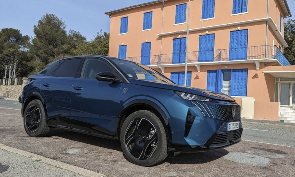 Peugeot E-3008 í reynsluakstri nálægt Cannes í Frakklandi. Hann verður fyrst settur á markað með 73 kílóvattstunda rafhlöðu, auk milds tvinndrifs. Tvö rafbílafbrigði til viðbótar munu birtast snemma árs 2025. Mynd: Peter Sigal