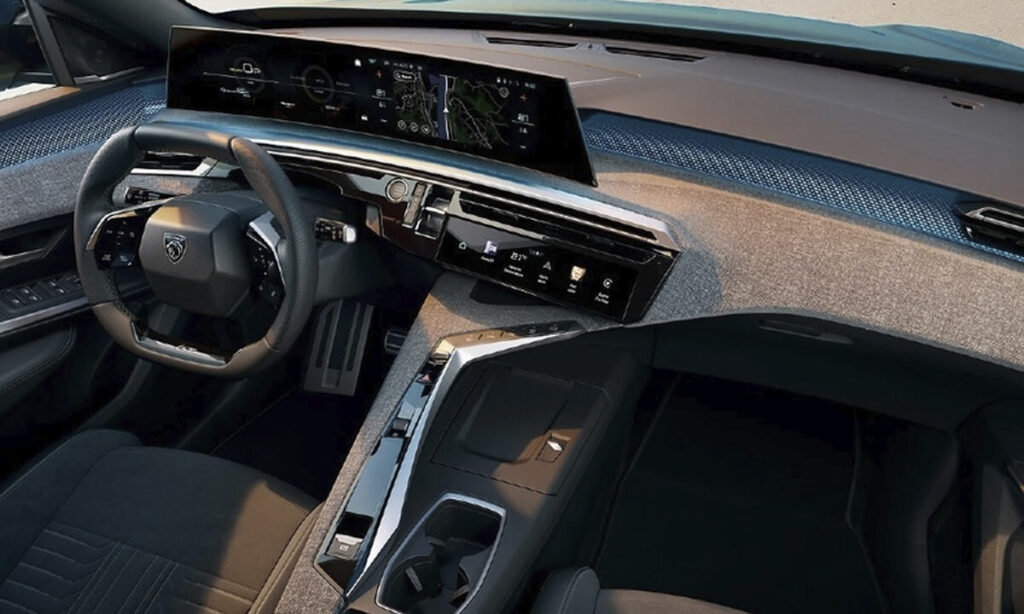 Yfirsýn yfir innréttingu nýja 3008, sýnir valfrjálsan 21 tommu víðsýnan skjá sem sameinar mælaborð og upplýsinga- og afþreying.