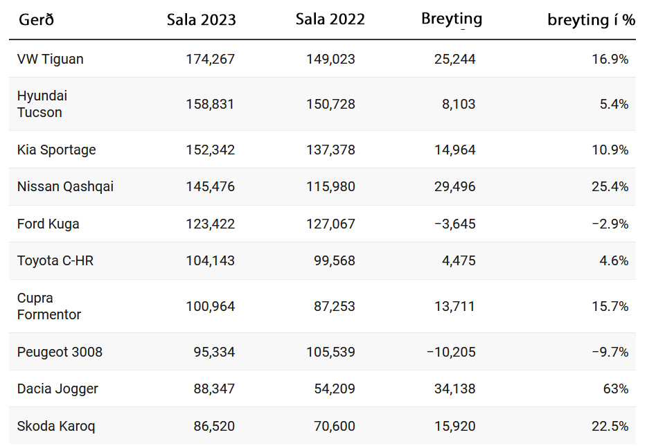 Mest seldi rafknúni sportjeppinn í Evrópu á síðasta ári var BYD Atto 3, en meira en 13.000 seldust. Sú tala er langt undir söluhæstu gerðum með brunavélum, þar sem Volkswagen Tiguan er fremstur í flokki með 174.267 sölu (sjá töflu að ofan).