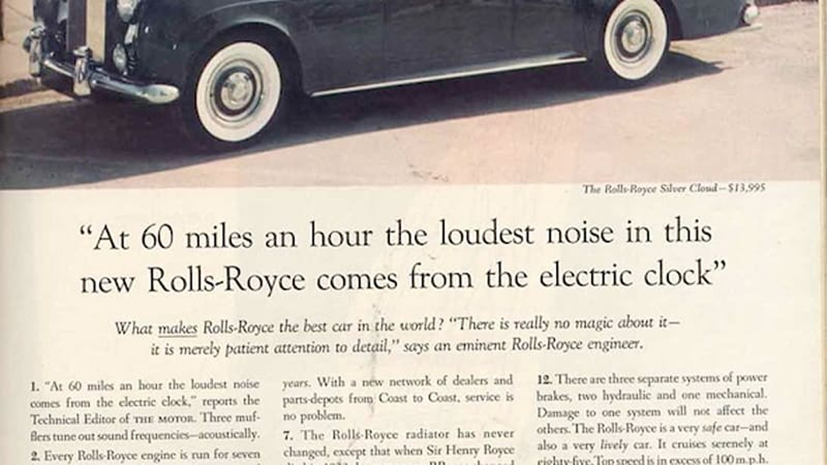 Og sú auglýsing er orðin það sem margir telja frægustu bílaauglýsingu allra tíma: „Á 60 mílna hraða kemur mesti hávaðinn í þessum nýja Rolls-Royce frá rafmagnsklukkunni“.