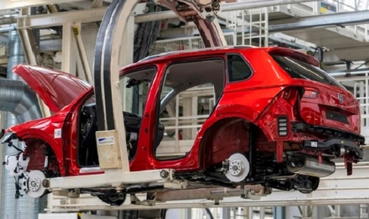 VW Tiguan í Wolfsburg 2021 – VW mun smíða rafmagns Tiguan sem hefst árið 2026. Hér á myndinni má sjá framleiðslu á núverandi brunavélargerð Tiguan í verksmiðjunni.