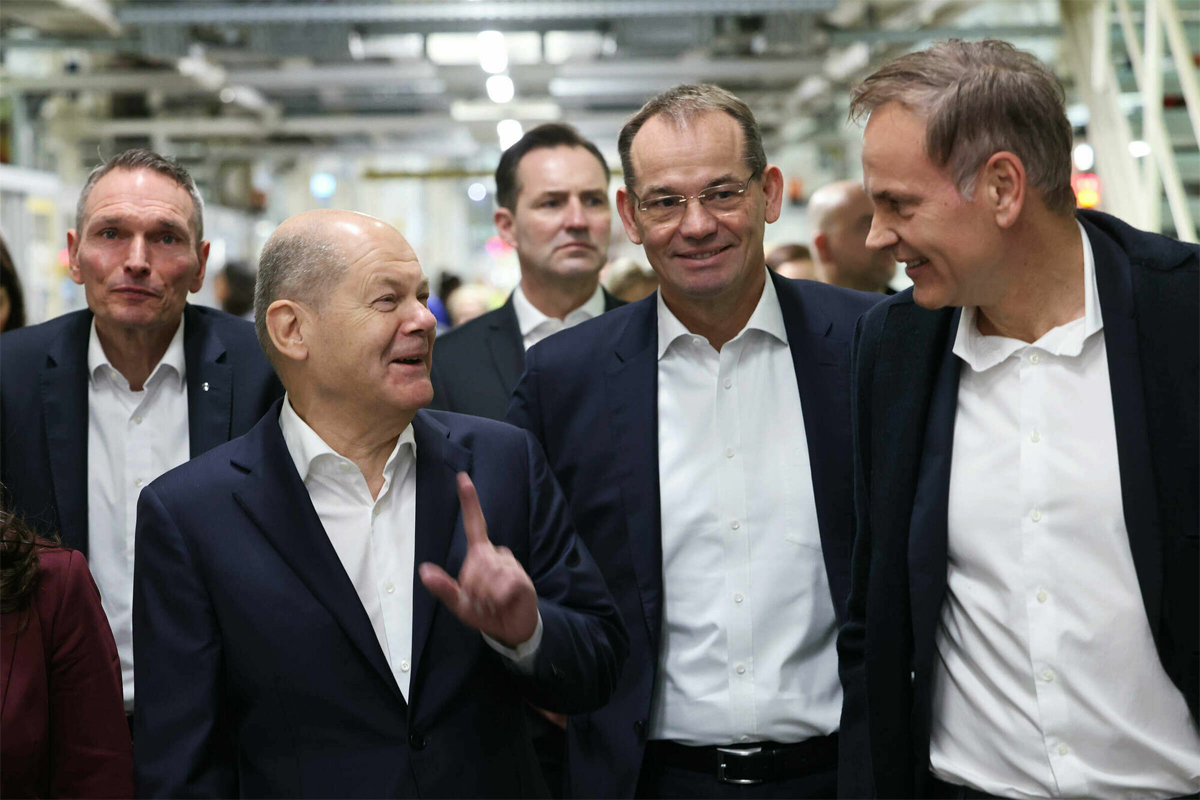 Olaf Scholz, kanslari Þýskalands, annar frá vinstri, í heimsókn sinni til VW á dögunum. Mynd: Volkswagen AG.