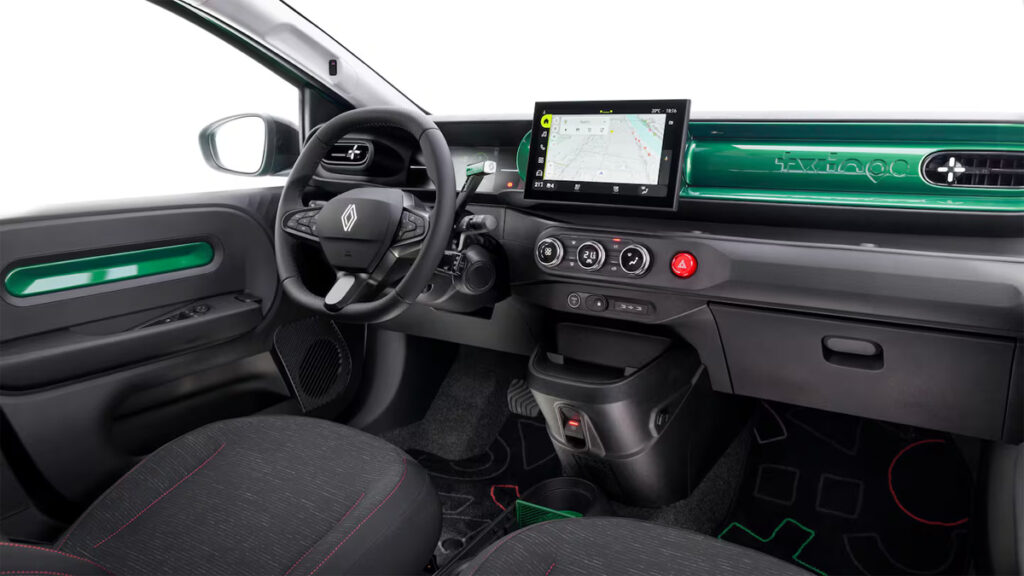 Þó að Twingo verði meðal ódýrustu rafknúnu ökutækja Evrópu, hefur Renault veitt honum fjölda þæginda og hagnýtra eiginleika. Að innan er 10 tommu miðskjár staðalbúnaður, ásamt 7 tommu stafrænu mælaborði. Leikjaþjónn Renault, Reno, hjálpar notendum að leiða sig í gegnum upplýsinga- og afþreyingarvalmyndirnar.