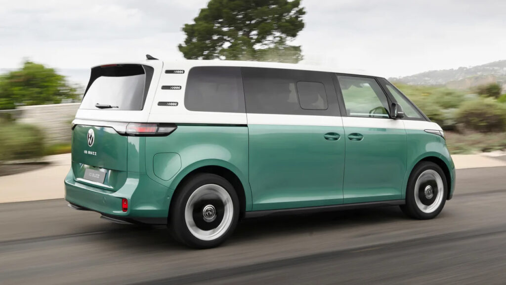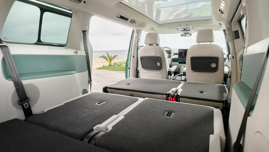 77k Wh rafhlaða er staðalbúnaður á LWB – það sama og þú finnur á öðrum ID.Buzz gerðum. Auka hjólhafslengdin þýðir að VW hefur einnig getað bætt við möguleikanum fyrir 82 kWh rafhlöðu.