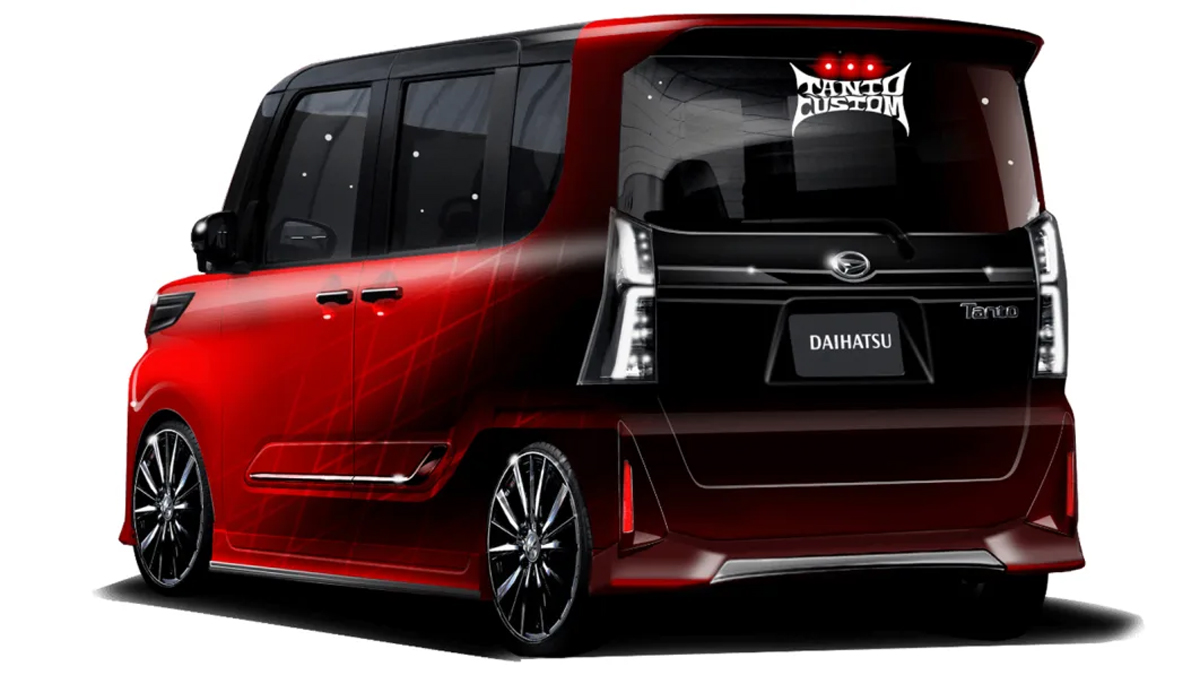 Næsta Daihatsu-par er aðeins hófsamari. Tanto Custom hér er að mestu uppfærður með áberandi rauðum og svörtum litum.