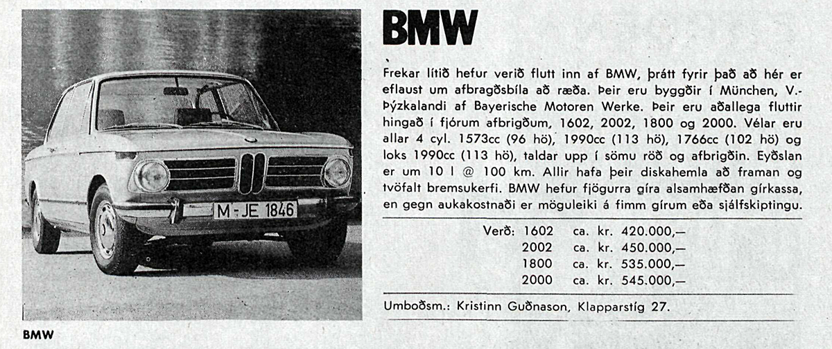 Það var Kristinn Guðnason, bílaumboð sem seldi Bimmana á þessum árum. Síðast var umboðið á Suðurlandsbraut 20 en hann seldi líka Renault bifreiðar.