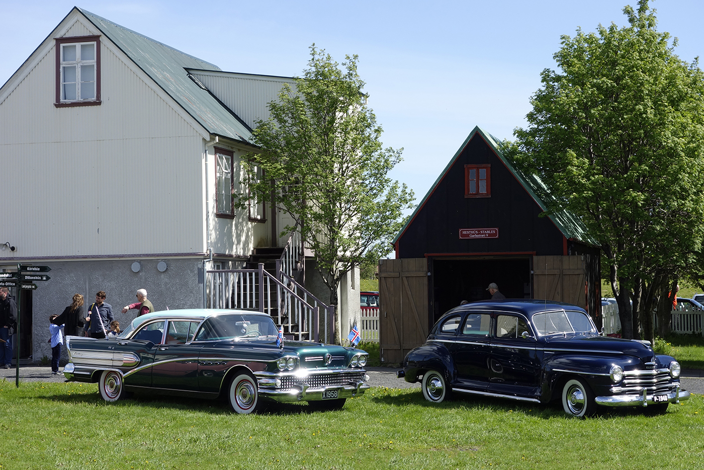 Glæsilegir bílar fara ávallt vel við gömul og virðuleg hús. Hér má sjá ´58 Buick og ´48 Plymouth.