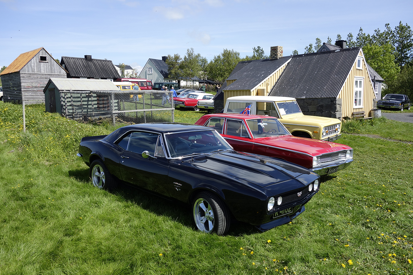 Nokkrir kaggar voru á svæðinu, líkt og þessi svarti Chevrolet Camaro árgerð 1967, en undir húddi hans leynist 427 kúbika vél, sem reyndar var ekki staðalbúnaður í Camaro fyrr en með andlitslyftingunni 1969. Við hlið hans eru Dodge Dart ´67 og Ford Bronco ´74.