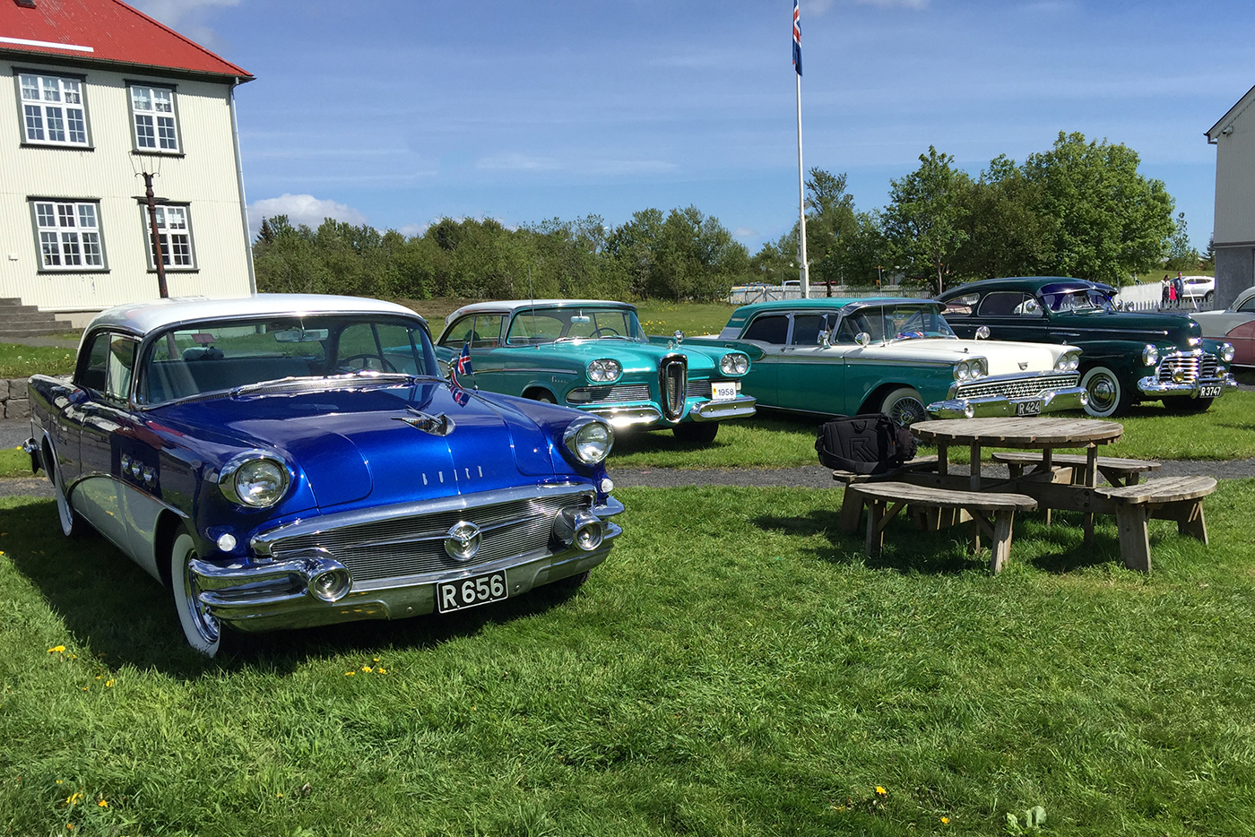 Það voru fjölmargir fornbílar samankomnir í Árbæjarsafni á 17. júní og voru þeir amerísku mest áberandi. Talið frá hægri: Chevrolet ´42, Ford ´59 og Edsel ´58.