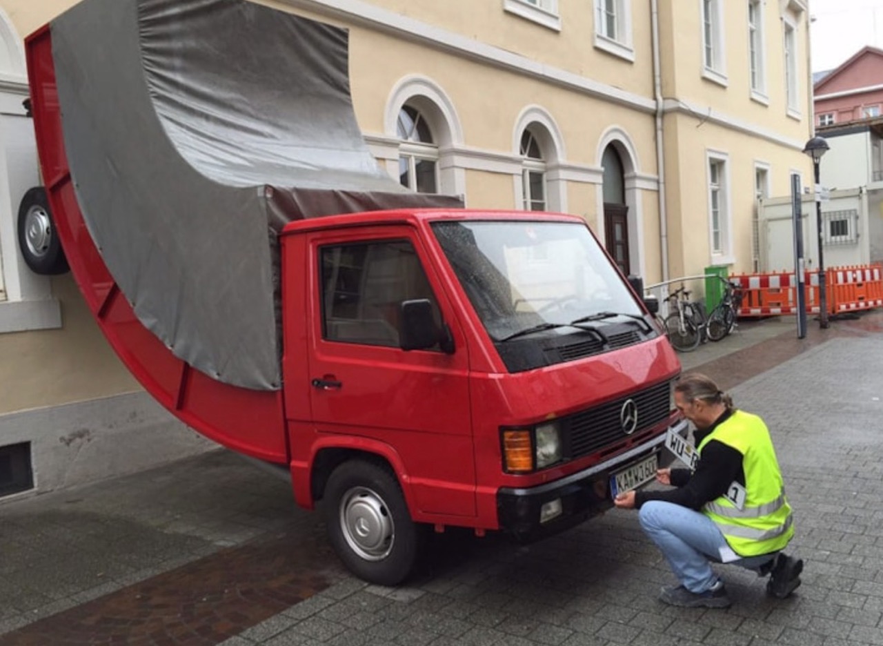 Sem betur fer er þetta ekki raunverulegt ökutæki. Þetta er listaverk eða svokölluð innsetning. Hugmynd listamannsins Erwin Wurm tengdist því að leggja í of lítið stæði og hversu sniðugt það væri ef bíllinn gæti nýtt það rými sem til væri; t.d. með því að fikra sig upp eftir veggjum. Jújú, það er áhugaverð „pæling“ en mögulega gagnslaus.