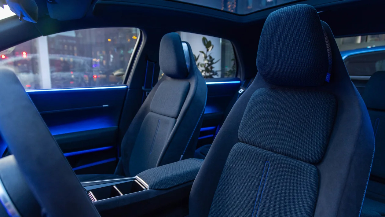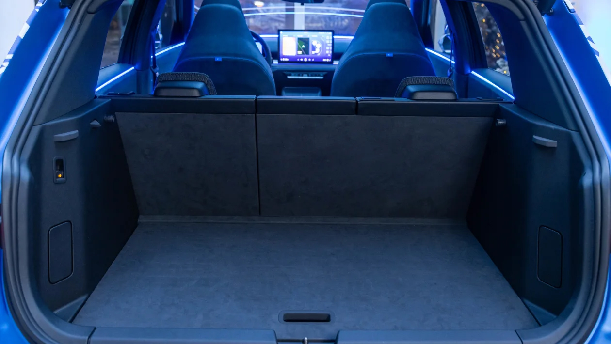 Val í gír hefur verið fært í stöng sem er fest er á stýrissúluna – breyting sem þegar hefur sést á nýjustu MEB gerðum VW – en á milli framsætanna er stýrisnúningsrofi sem er sagður vera til að skipta á milli akstursstillinga.