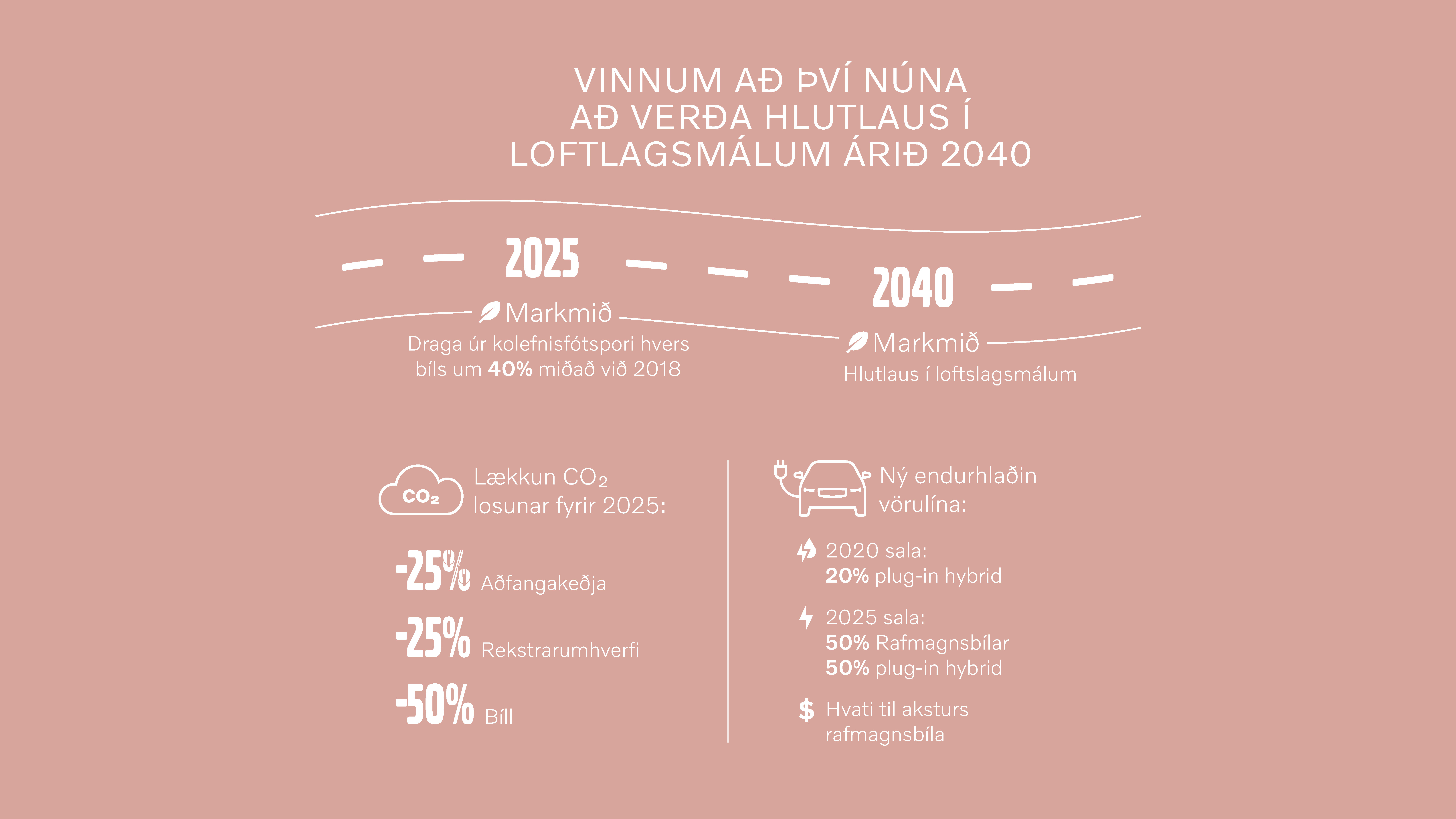 Til að átta sig á umtalsverðri 40% lækkun CO2 losunar hvers bíls fyrir árið 2025 hefur fyrirtækið sett fjölda markmiða fyrir mismunandi hluta starfseminnar. Upphaflega markmiðið að 50% af heildarsölu væru rafmagnsbílar fyrir árið 2025 er sterkt en það myndi leiða til 50% lækkunnar á CO2 losun á hvern bíl á árunum 2018-2025.